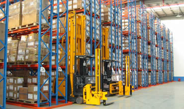 此類倉庫中,低、高位倉庫大多用前移式電瓶叉車、平衡重電瓶叉車、三向叉車進行存取作業,貨架較矮時也可用電動堆高機,超高位倉庫用堆垛機進行存取作